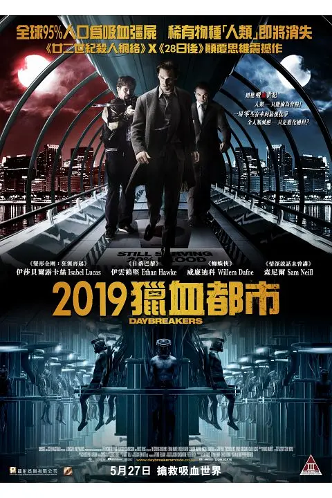 曾经由人类主宰的社会如今变成了吸血鬼的天下,而仅存的人类被圈养起来成为制造新鲜血液的机器。人类的数量越来越少,吸血鬼必须研究出血液的替代品,否则将面临更加恐怖的变异。爱德华·道尔顿(伊桑·霍克 饰)是专门研究新型替代品的首席血液专家,他的老板查尔斯·布罗姆利是一位野心家,他非常满意当前吸血鬼世界的现状并企图通过垄断新的替代品获得巨额利润。一次意外爱德华遇到了逃亡中的人类奥德丽·班尼特(克劳蒂娅·卡万 饰),并帮助她摆脱追捕,不料事后奥德丽居然找上门来,并且带来了在一次意外中由吸血鬼奇迹般变成人类的艾维斯,仅存的人类需要一个可以信任的吸血鬼的帮助…… 斯派瑞格兄弟(Peter Spierig & Michael Spierig)在此片中将以往的吸血鬼类型片进行改造,融入科幻的元素打造出全新的故事氛围收起